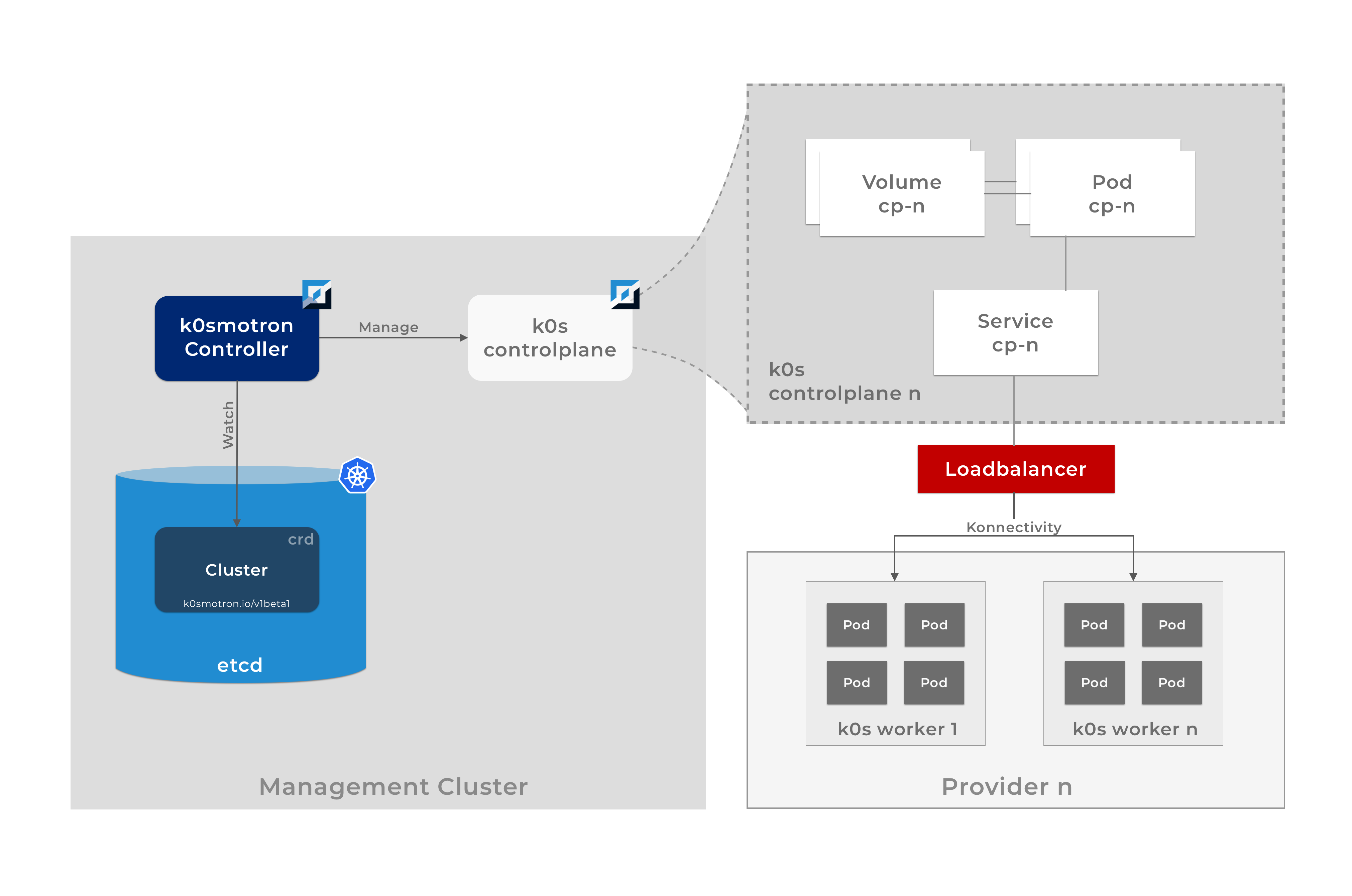 Using k0smotron the clusters controlplane and workerplane are truly separated. The controlplane, running on an existing cluster has no direct networking connection to the workerplane. This is similar pattern how all the major cloud providers separate the control and worker planes on the managed clusters.